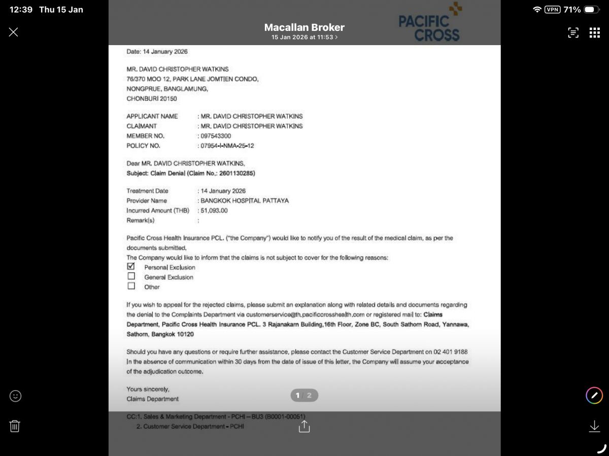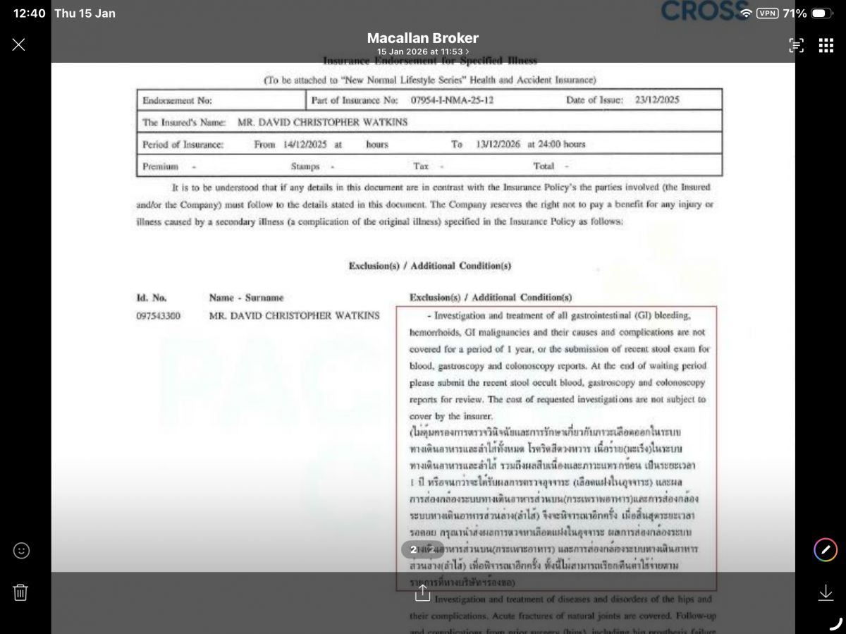 So basically where we are now is the insurance brokers have said no they're not gonna give me the operation and no they're not gonna give me chemotherapy. The reason being as there was a technicality back in 2024 where they found microscopic particles of blood in my faeces and they are standing firm on that I am gonna try and fight this however I feel like it is a loss cause as they are in a very strong position which I have been told my other alternative now is to go down the Thai hospital route which I will be exploring this weekend and next week I see my doctor tomorrow and I will get a referral letter from her and also start the procedure to get all my medical records within the next 5 to 7 days as of Monday it has been two weeks since I've had a definite diagnosis of bowel cancer. The clock is ticking.